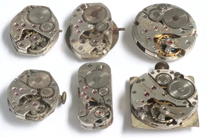 The condition of these parts is as depicted in the provided photographs. Items may be either functional or non-functional; please refer to the description above for specifics. We have not disassembled non-working movements and other complex components, so we cannot guarantee their completeness or functionality. None of the items have been serviced or cleaned. We recommend these parts for sale to hobbyist watchmakers and watch collectors only.